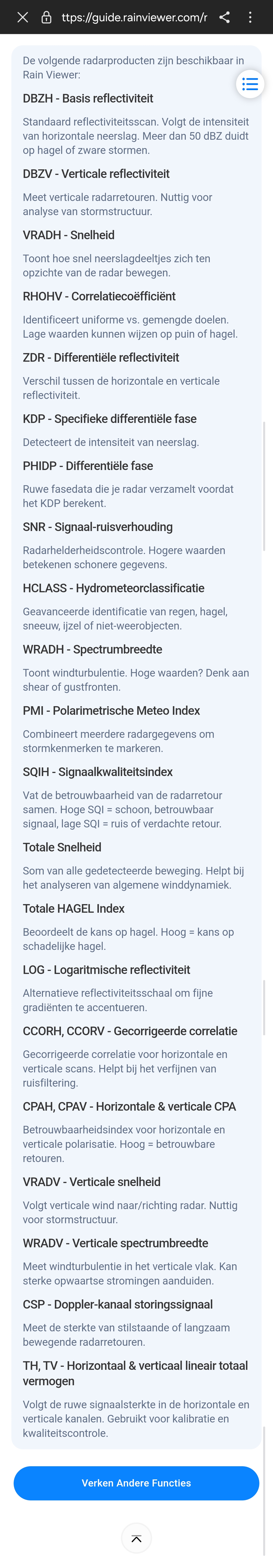 Deels idem als WeatherWise. Radar individueel te selecteren, alleen iOS en Android. Alle elevaties beschikbaar in Pro. Producten (Pro versie): DBZH-Reflectiviteit, DBZV-Verticale Reflectiviteit, VRADH-Snelheid, VRADV-Verticale Snelheid, WRADH-Spectrum Breedte, WRADV-Verticale Spectrum Breedte, KDP-Specifieke Differentiële Fase, PHIDP-Differentiële Fase, RHOVH-Correlatie Coefficiënt, UPHIDP-Ongefilterde Differentiële Fase, SQIH-Signaal Kwaliteitsindex, SQIV-Verticale Signaal Kwaliteitsindex, CCORH-CCOR, CCORV-Vertical Clutter Correction, CPAH-CPA, CPAV-Vertical Clutter Phase Alignment, UDBZH-Ongefilterde Reflectiviteit, UBZV-Ongefilterde Verticale Reflectiviteit. Totaal overzicht radarproducten Rain Viewer De radarproducten van het KNMI zijn alle beschikbaar, van DWD slechts enkele.