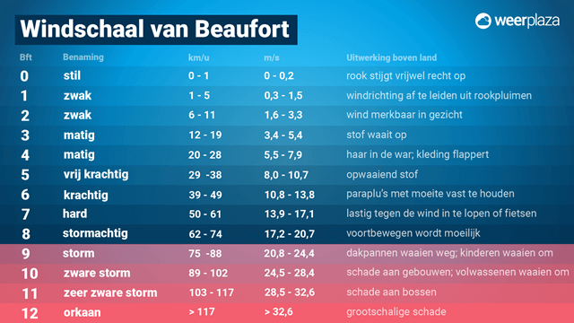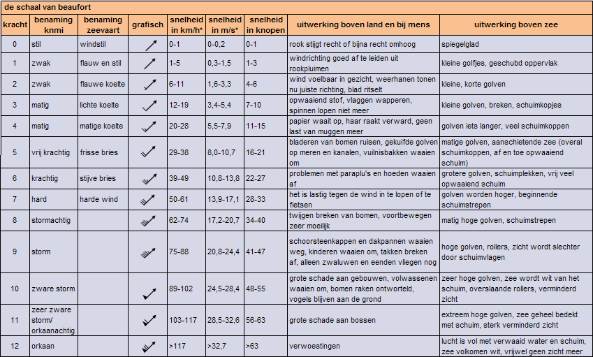 Omrekenenen Schaal van Beaufort, km/u, m/s, knopen, vaantjes | Meteo Tuitjenhorn.